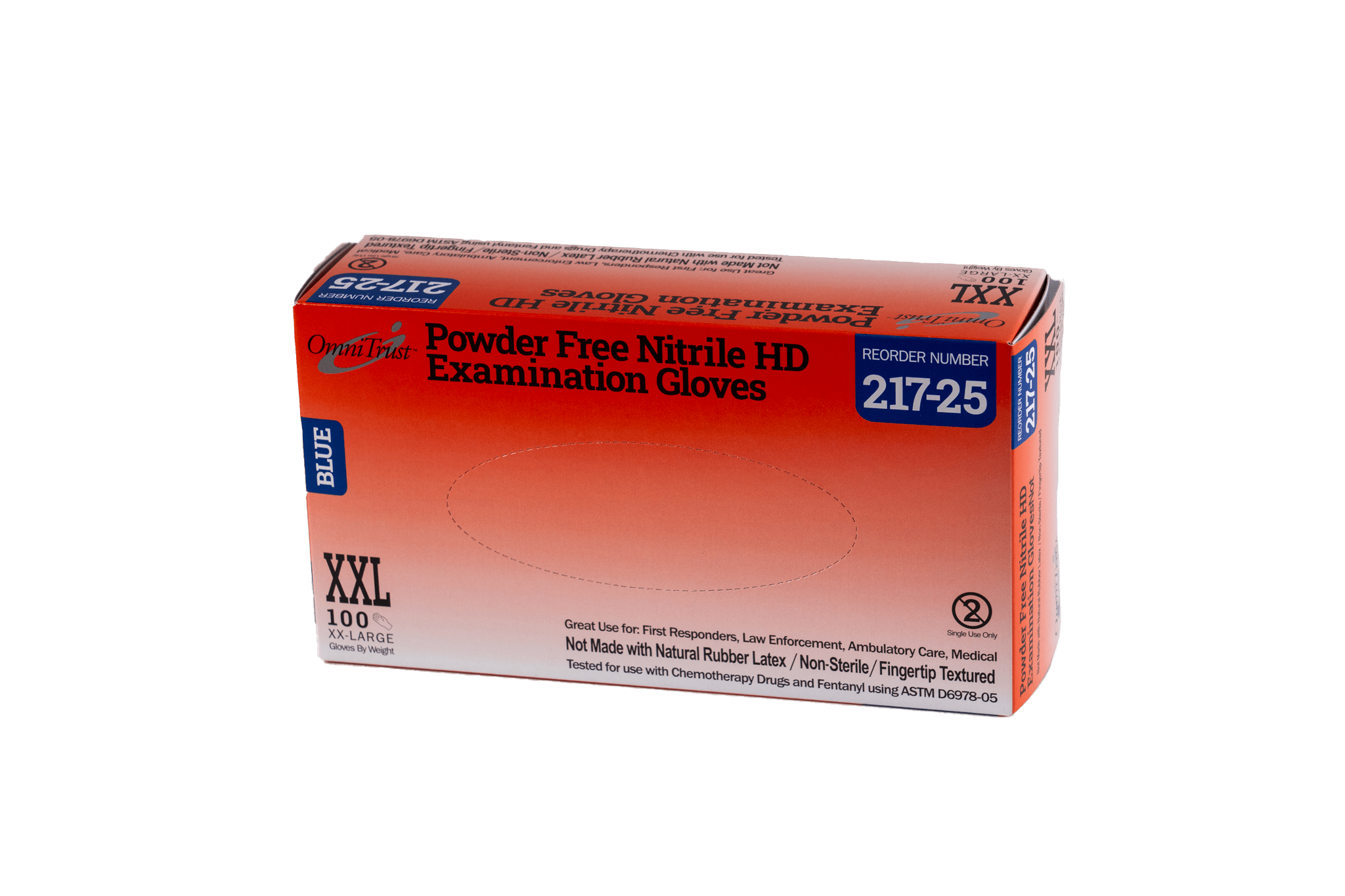 Introducing our OmniTrust Fentanyl Resistant Powder Free Nitrile Examination Glove. This provides ideal protection for use in Law Enforcement, First Responders, and Correctional Facilities where the presence of Fentanyl is known or highly suspected. The 217 series glove is very strong and durable, providing exceptional barrier protection in the following environments: tattoo, automotive, laboratory, chemical and industrial manufacturing, veterinary, cannabis, printing, and security industries. Our 217 series has a smooth finish with textured finger tips for added grip control and is flexible for tactile sensitivity. OmniTrust Fentanyl Resistant Nitrile Powder Free Examination Gloves are flat packed for optimum dispensing and available in sizes X-Small through XX-Large.